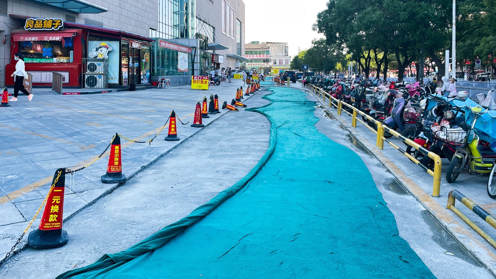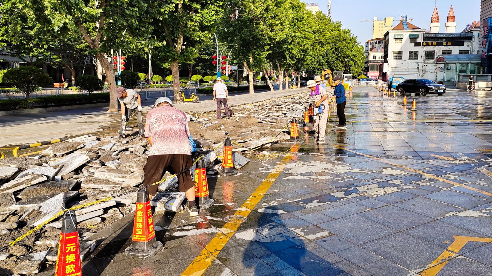 車道改造施工期間,因原車道無法通車,特制定應急方案,將南廣場原行車道北側、東南廣場西側、東廣場西側以路錐攔出一個3米的通道,供車輛通行。東廣場改造車道兩側可側方停車。拆磚、清理路面及鋪設混凝土交叉施工,確保車輛正常通行和停放。
